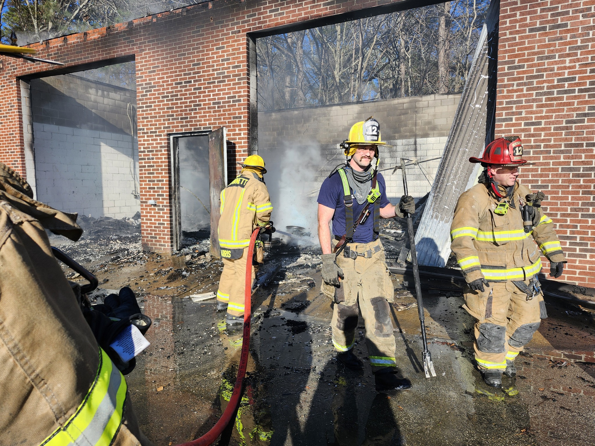The 911 caller reported seeing smoke and flames coming from the rear of the business. Fire crews arrived on scene at 2:33 p.m. and found an active fire in a single-story detached garage located behind the main store. Fire was venting through the roof, and part of the structure had collapsed.