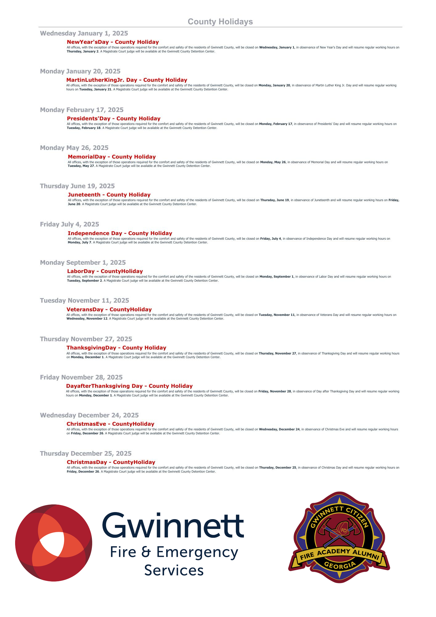 Gwinnett County Offices — Holidays List