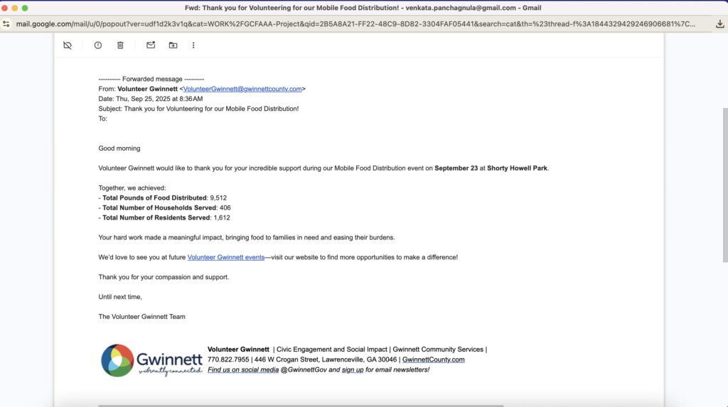 👏🎉Appreciations – Volunteer Gwinnett — Mobile Food Distribution 🎉👏 Our team received appreciation from the Volunteer Gwinnett Team for their contribution to the Mobile Food Distribution on 23-Sep-2025 at Shorty Howell Park. ” Volunteer Gwinnett would like to thank you for your incredible support during our Mobile Food Distribution event on September 23 at Shorty Howell Park. Your hard […]