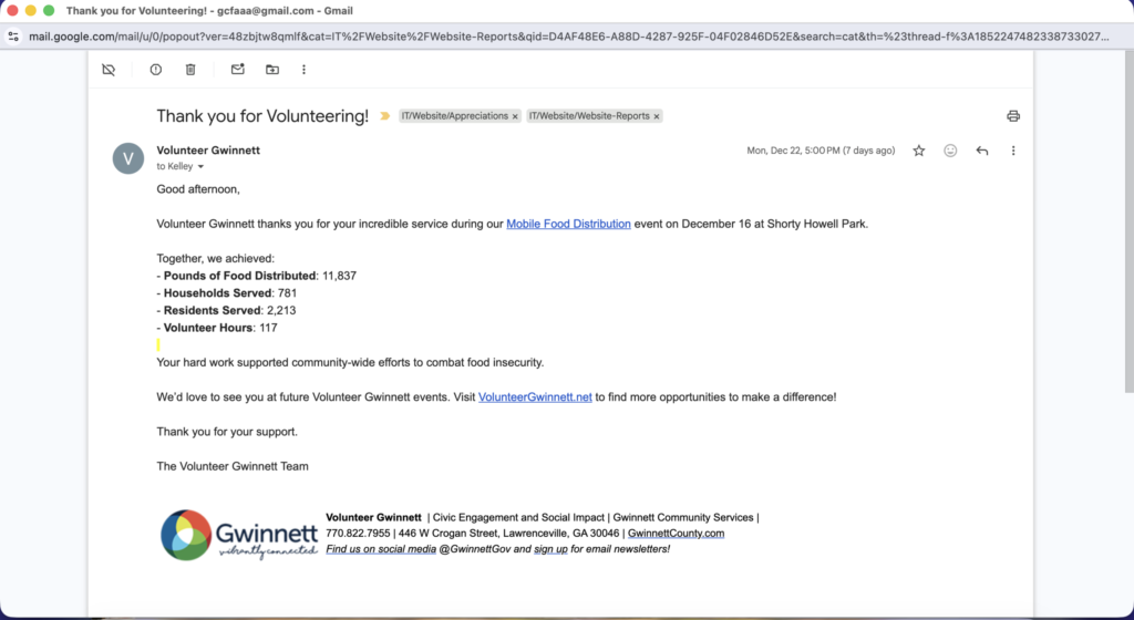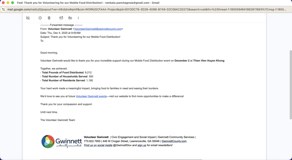 👏🎉Appreciations – Volunteer Gwinnett — Mobile Food Distribution 🎉👏 Our team received appreciation from the Volunteer Gwinnett Team for their contribution to the Mobile Food Distribution on 16-Dec-2025, at Shorty Howell Park. ” Volunteer Gwinnett would like to thank you for your incredible support during our Mobile Food Distribution event on December 16 at Shorty Howell Park. Your hard […]
